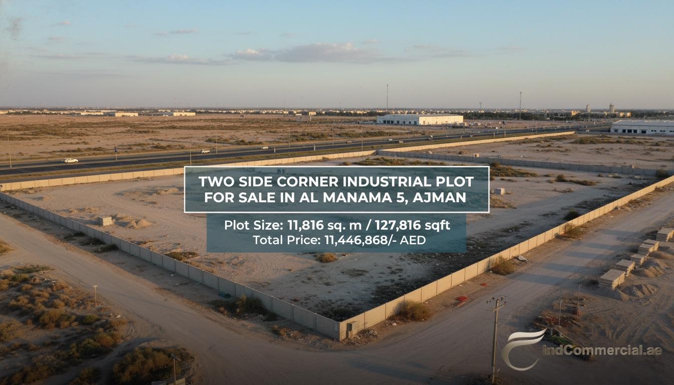 Discover a premium corner industrial plot for sale in the rapidly developing Al Manama 5 area of Ajman. This spacious two-side corner plot offers 127,816 sq ft (11,816 sq m) of land with excellent road access and visibility — perfect for establishing warehouses, workshops, or light industrial facilities.